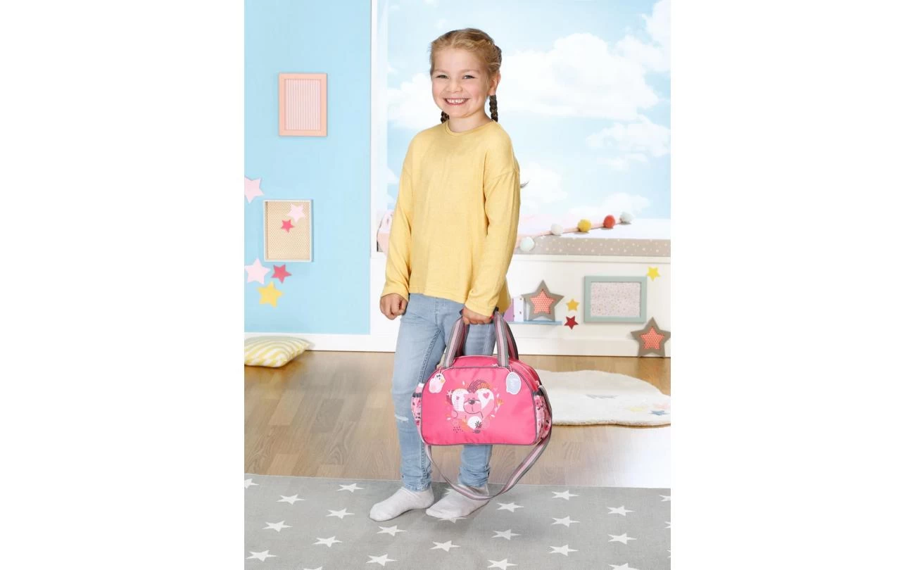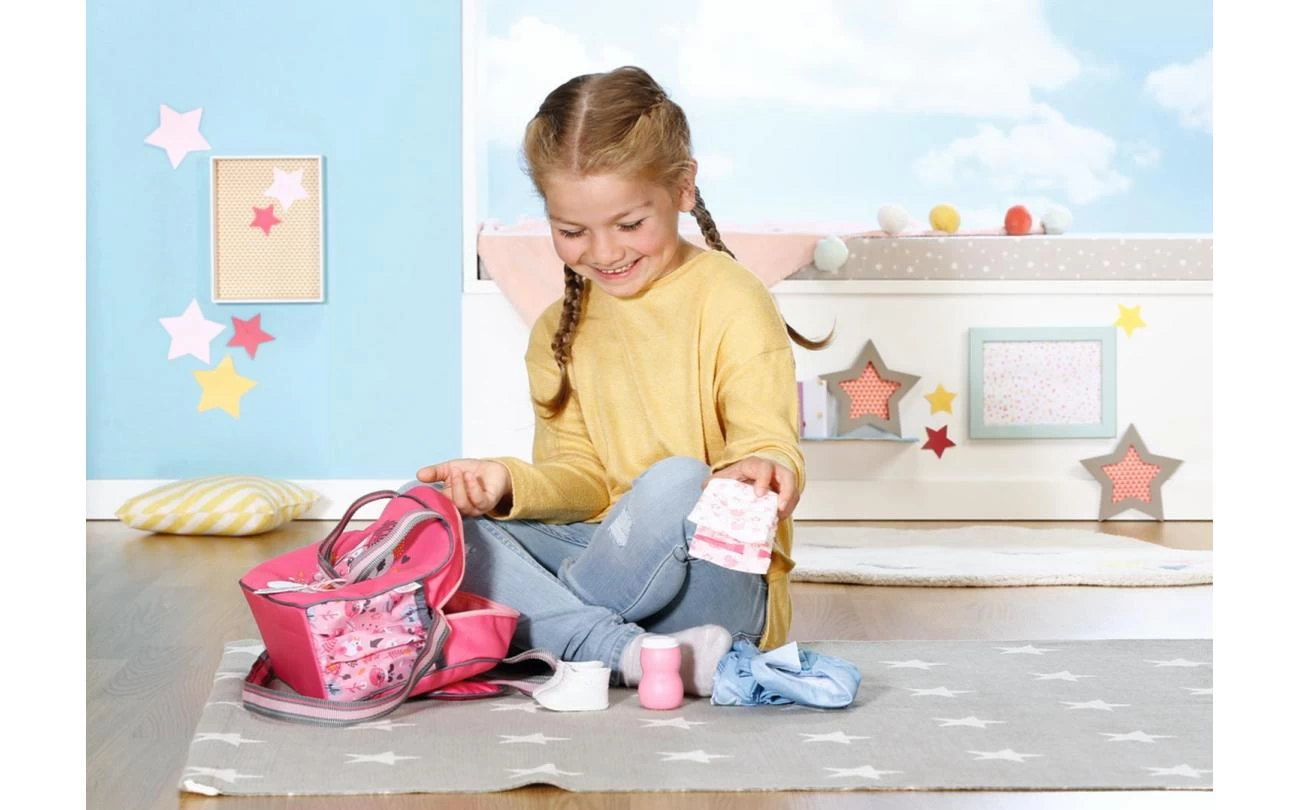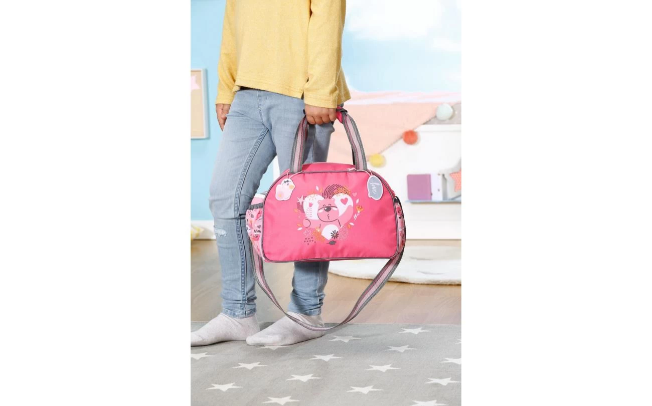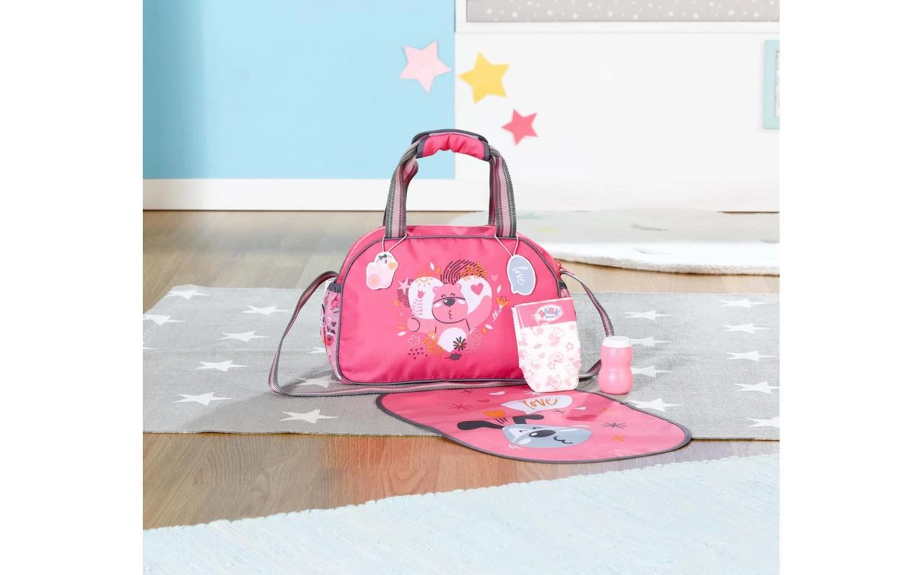 BABY born verheugt zich op elk uitstapje, net als haar dierenvrienden op de luiertas. Oeps, ze was zo opgewonden dat ze een plasje heeft gedaan. Gelukkig heeft mama de handige luiertas meegenomen, waar alles inzit wat een baby nodig heeft: een verschoonmatje, een luier en een flesje poeder. Er is ook genoeg plek voor een flesje om tussendoor uit te drinken, een overzicht van de bustijden en eventuele souvenirs. Je kunt de tas comfortabel over je schouder of in je hand dragen. Aan de draagbanden zitten schattige labels waar BABY born mee kan spelen terwijl ze wordt verschoond.