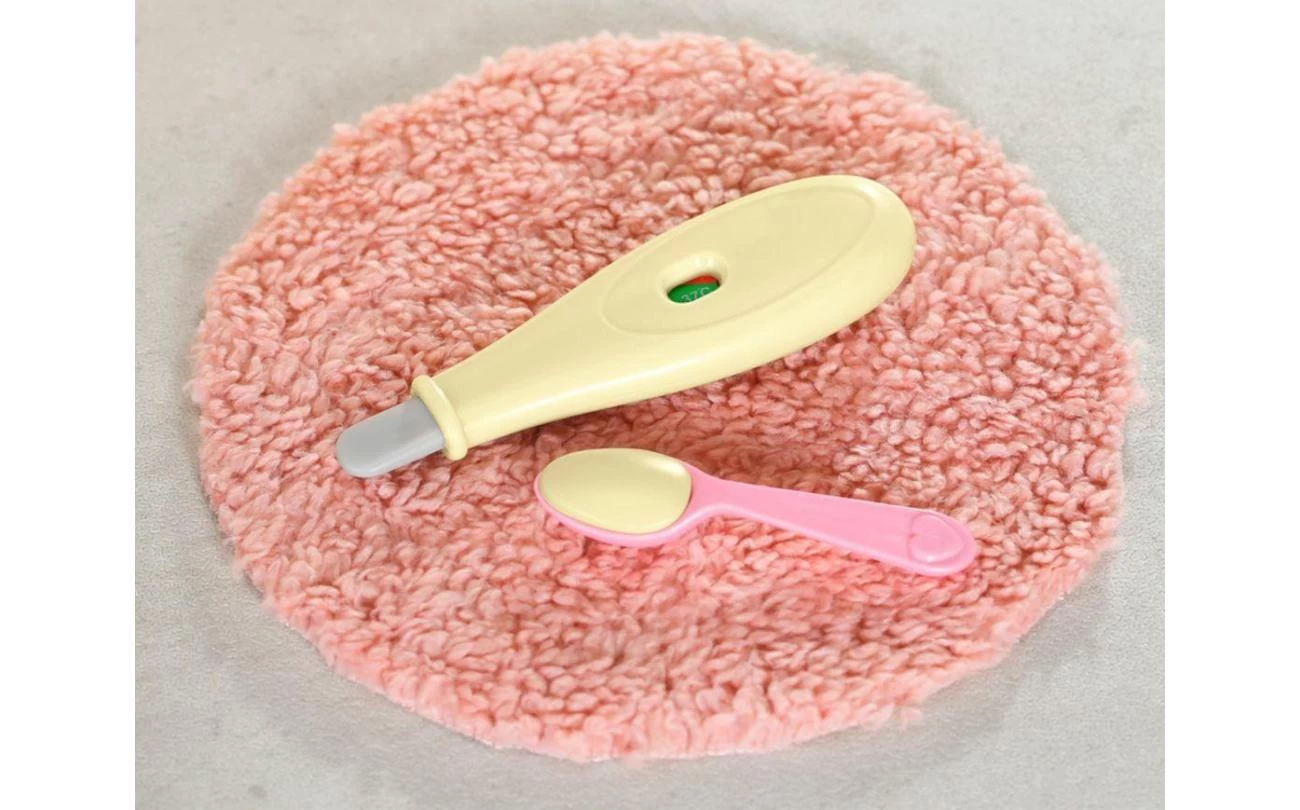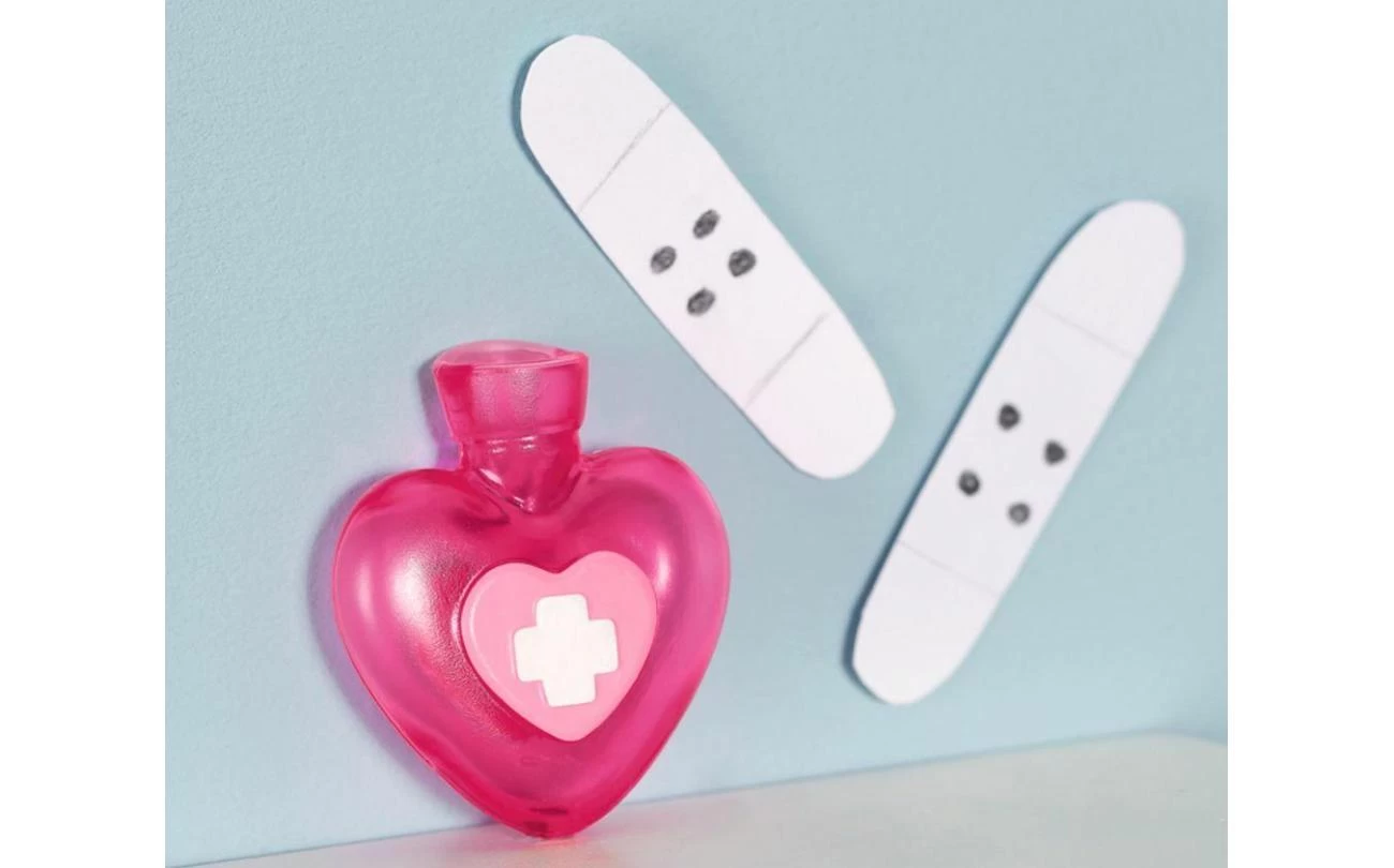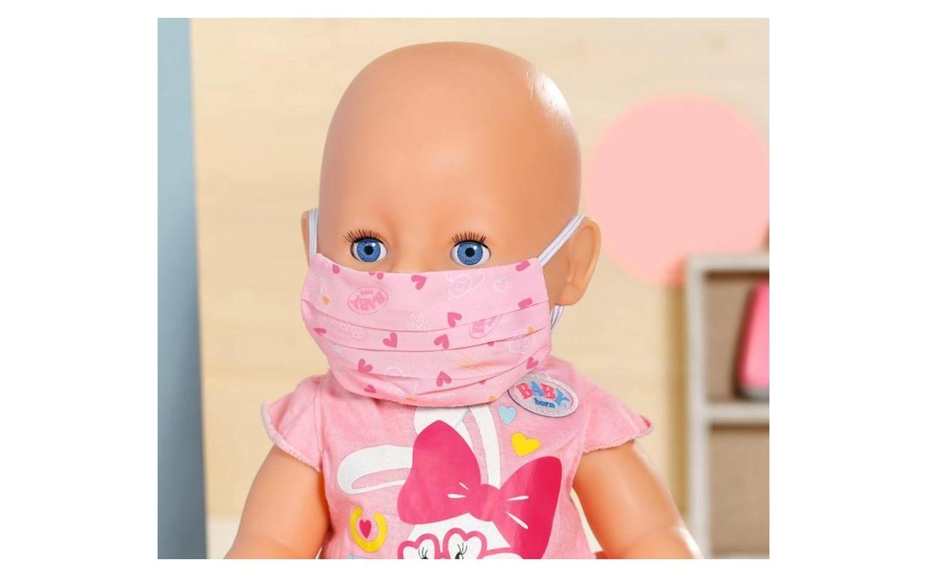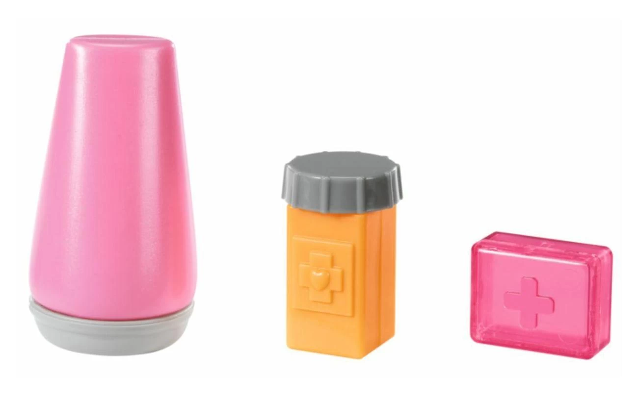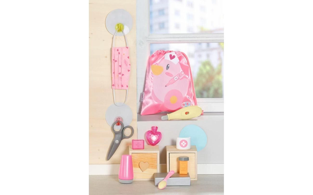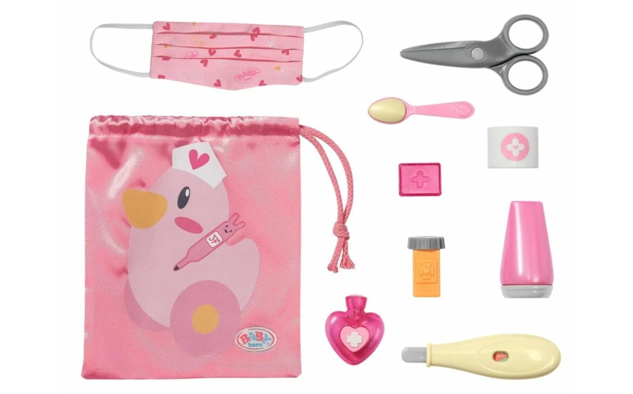 Heel professioneel, net als een echte eerstehulpverlener, doet hij zijn roze gezichtsmasker voor. Daarna haalt hij alles wat hij nodig heeft uit de tas om de snee in BABY borns knie te verzorgen: een tube crème en een verband dat hij met de schaar op maat kan knippen. BABY born is verbaasd dat er ook een pillendoosje, medicijn en een lepel in de set zitten. Gelukkig heeft ze op dit moment geen medicijn nodig. Haar broer wil voor de zekerheid haar temperatuur opnemen. De kleine meid heeft een beetje verhoging door alle opwinding, maar misschien kan ze de kruik gebruiken als ijspack. Daarna worden de negen medische hulpmiddelen weer in de tas gestopt, waar Berta de eend op staat in de rol van verpleegkundige.