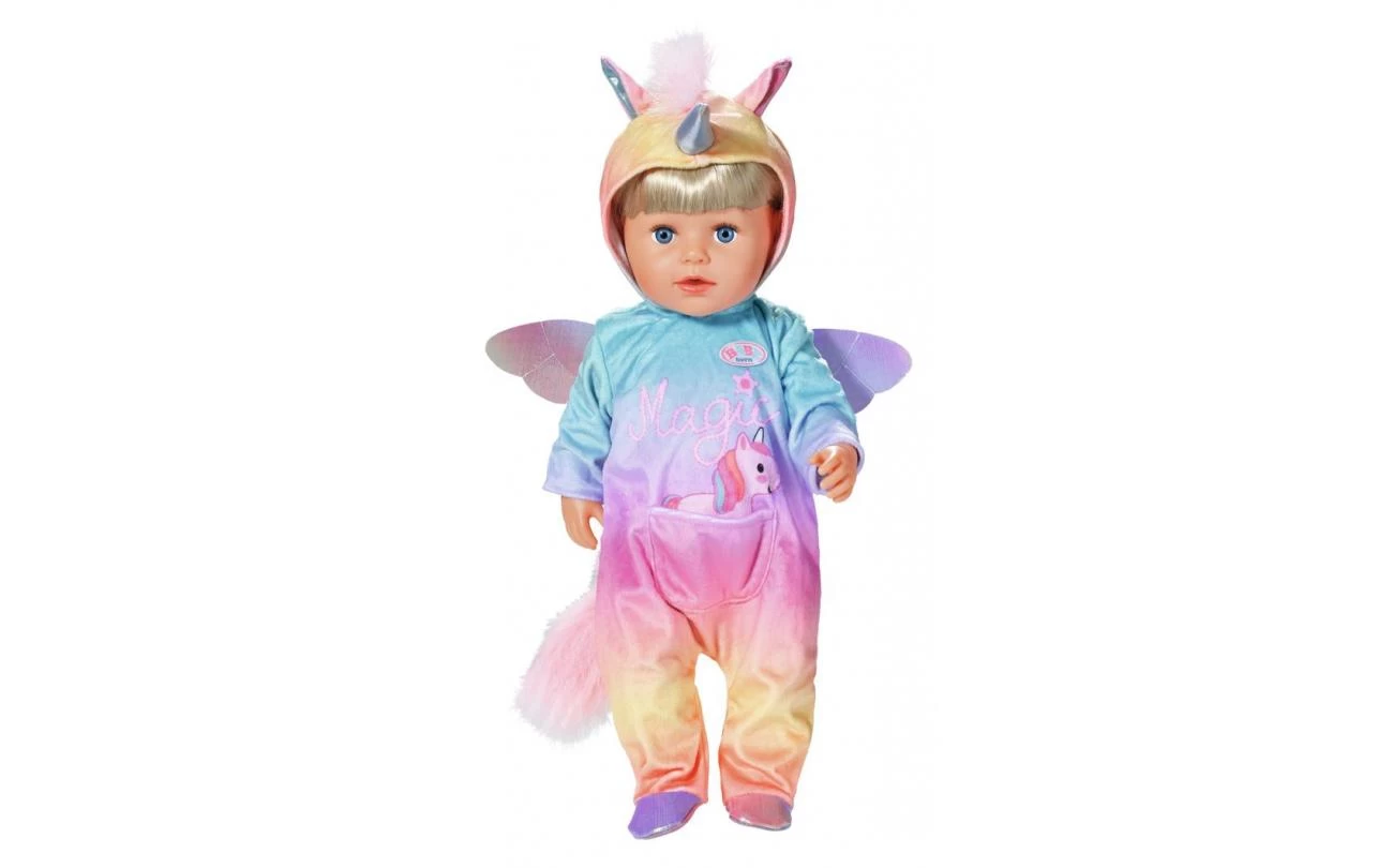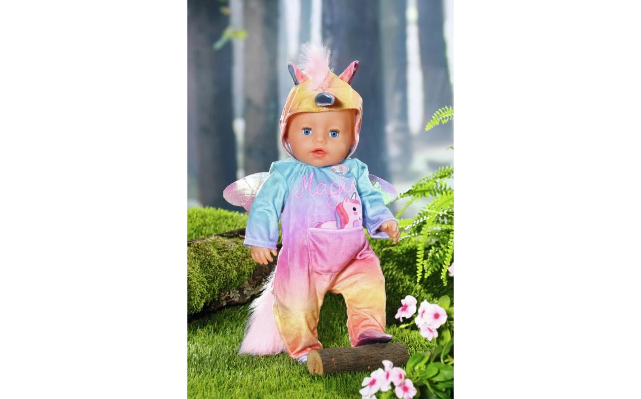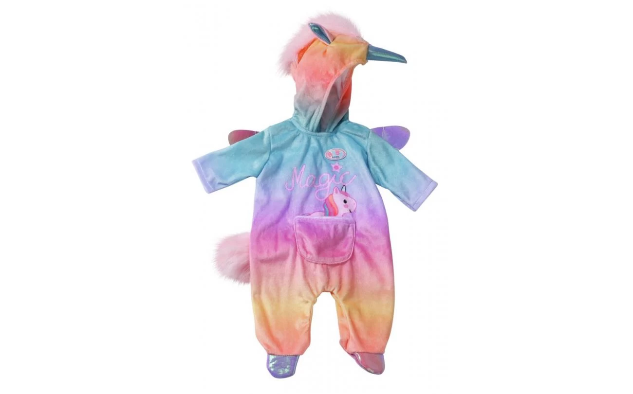 Een eenhoorn is magisch, en BABY born is betoverend in haar eenhoorn-onesie. De knusse onesie van regenboogstof heeft een capuchon met schattige oren, een glinsterende hoorn en eenhoornmanen. Op de rug zitten glittervleugels en een roze staart. In het voorzakje zit een schattige eenhoornprint verstopt. Dat is pas magie!