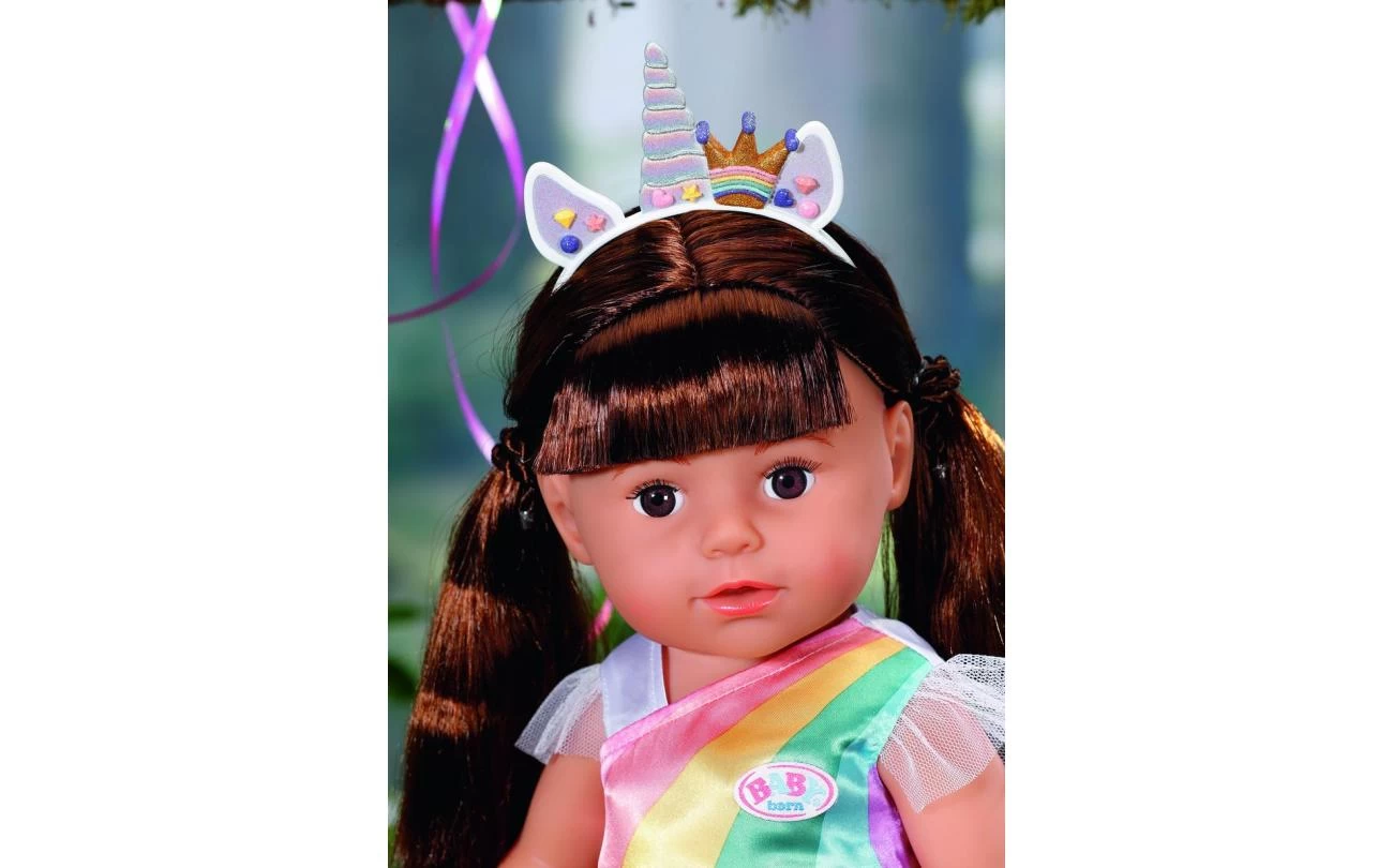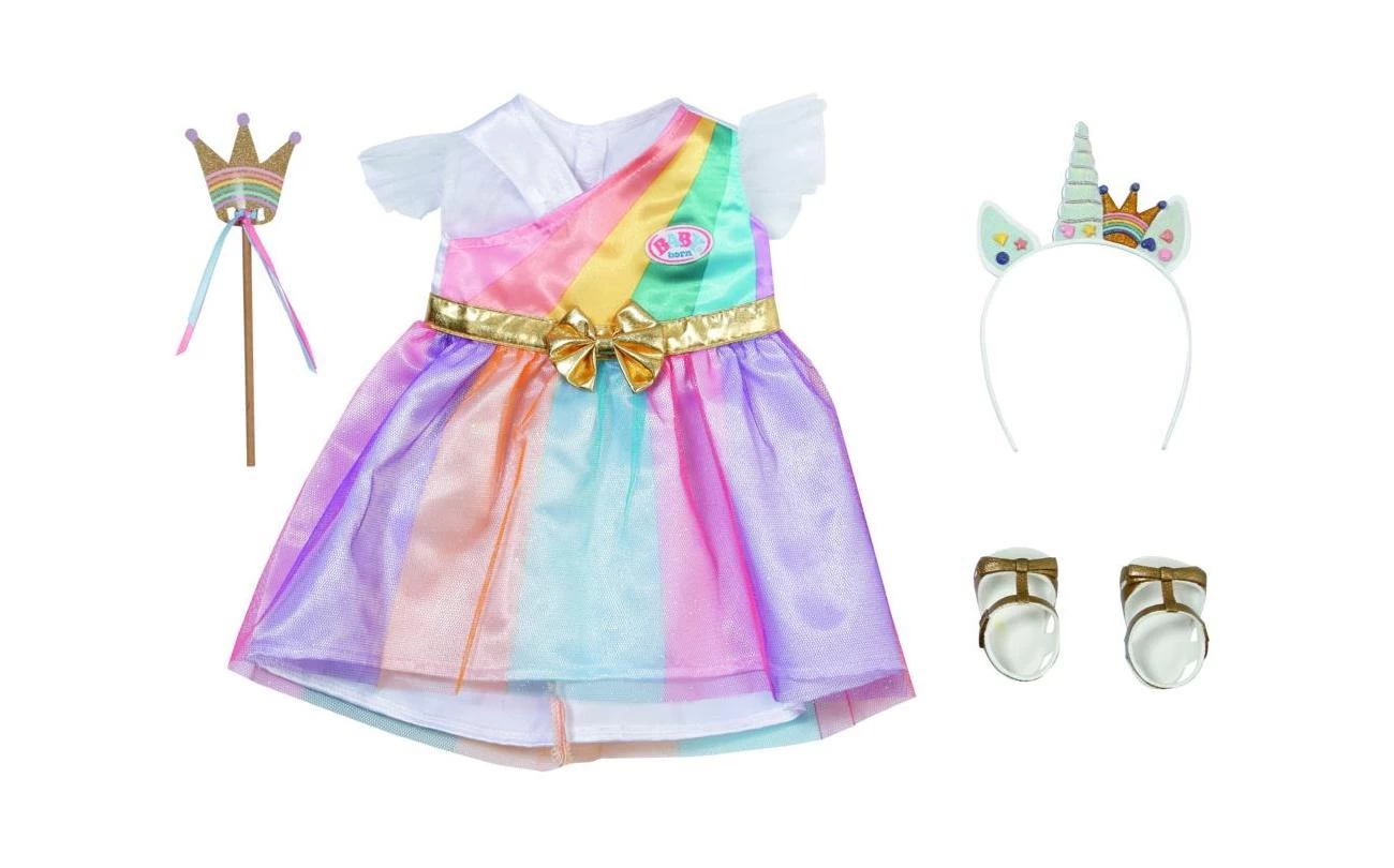 Van dansen houden ze trouwens allebei. Deze prinsessenjurk met regenboogkleuren is perfect om een pirouette mee te maken en de tulen overrok glinstert magisch. Door het asymmetrische model is het net alsof de pop een sjerp draagt. De gouden sandalen passen heel mooi bij de strik rond haar middel. Koppig of niet, een haarband met eenhoorn, kroon, schattige oortjes en verwijderbare speldjes zijn een must.