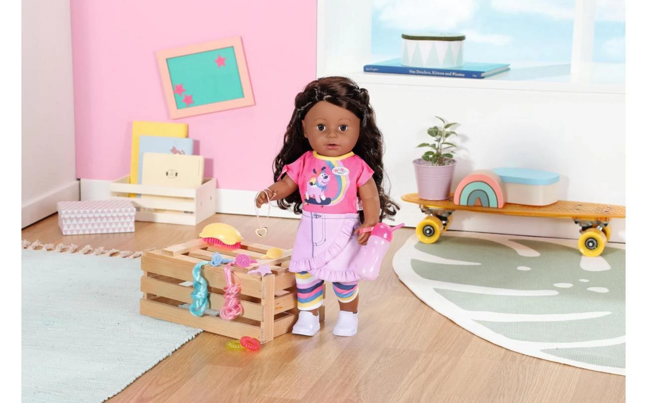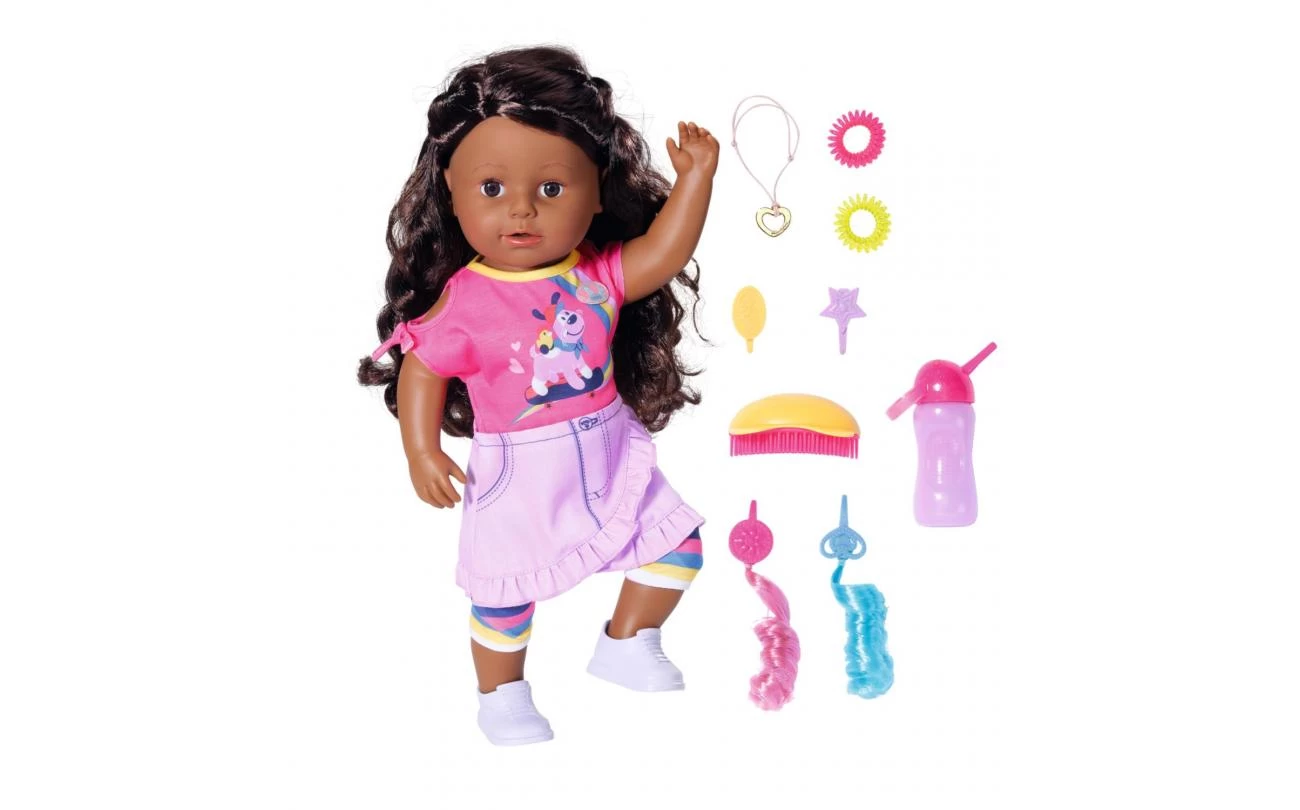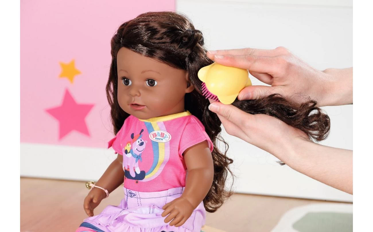 BABY born is gefascineerd door de lange lokken van haar zus en wil altijd kappertje met haar spelen. Enthousiast maakt ze de kleurrijke strengen vast in haar haar. De roze en turkooizen strengen contrasteren mooi met het donkere haar. Het poppenkind wacht geduldig terwijl haar haar wordt geborsteld met de haarborstel en de vlechten worden versierd met elastiekjes en clips. Soms trekt de kapster iets te hard aan haar haar en dan huilt ze poppentranen. Maar alleen als ze eerst water heeft gedronken uit haar drinkfles.