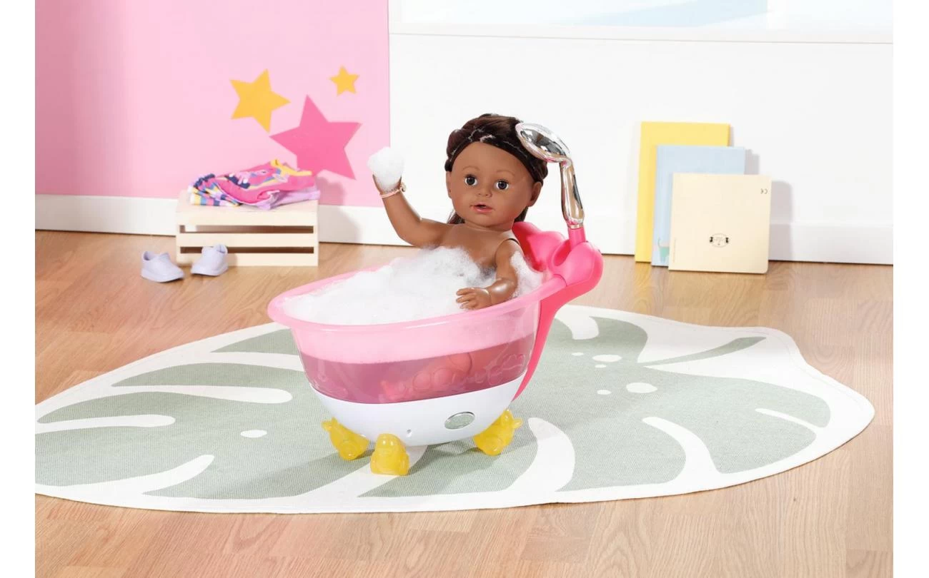 Dankzij haar buigbare knieën kan Zus niet alleen comfortabel zitten, maar ook zelfstandig staan. Maar waarom zou je zitten of staan als je kunt relaxen in de BABY born Badkuip?